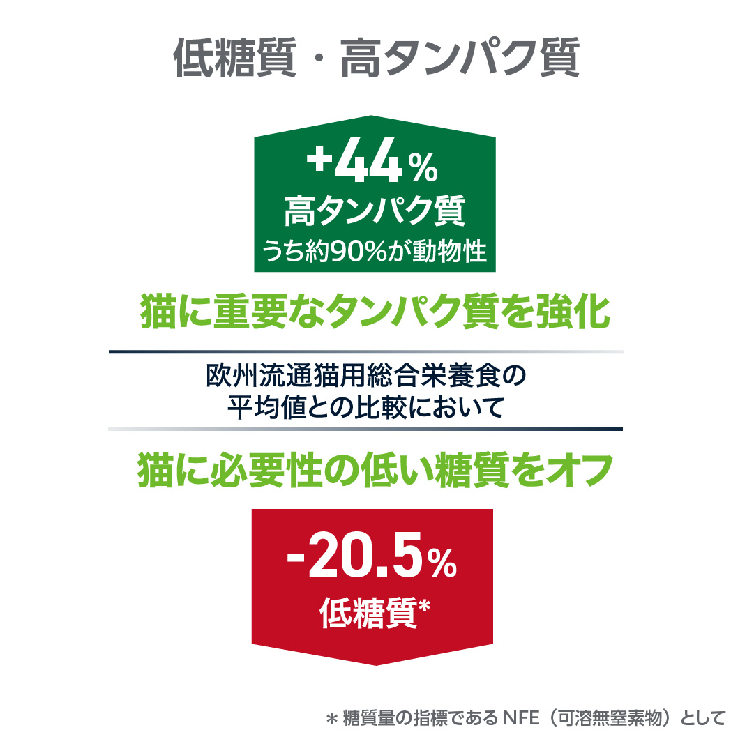欧州動物病院販売の主要ペットフードの平均値との比較において、猫に重要なタンパク質を強化、猫に必要性の低い糖質をオフ。筋肉量と体重管理をサポート、脂肪を蓄積し過ぎない健康的な体をサポート、動物性タンパク質によるさまざまな健康維持への利点、低糖質組成で消化管の健康をサポート
