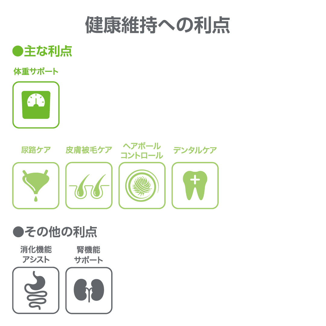 動物性タンパク質の含有量が、水分摂取と健康的な尿路を保ち、pHを安定化させることで、結石が形成しにくい健康的な尿路環境をサポートします。
