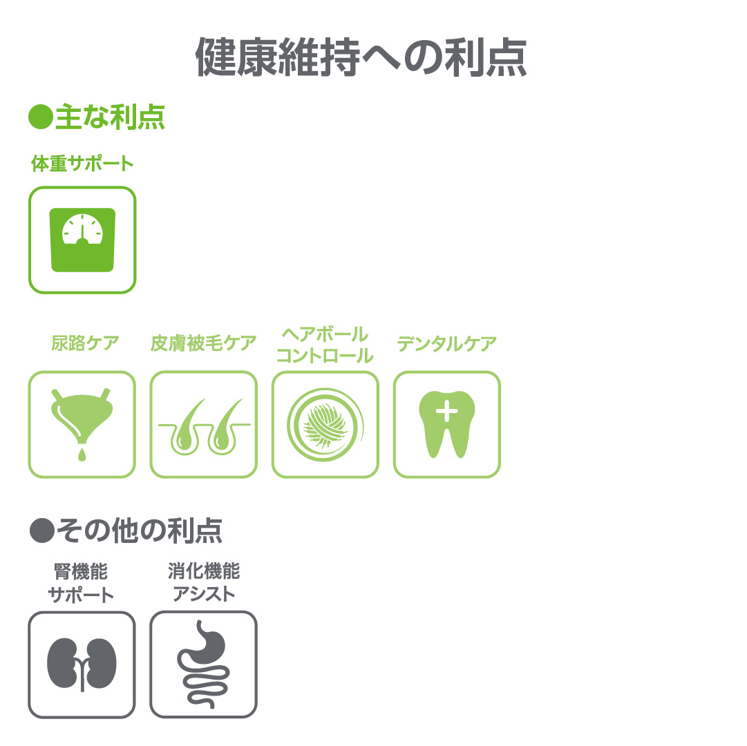 低糖質・高タンパク質組成が健康的な水分代謝を促し、リン含有量の低い良質なタンパク質により腎機能の維持をサポートします。