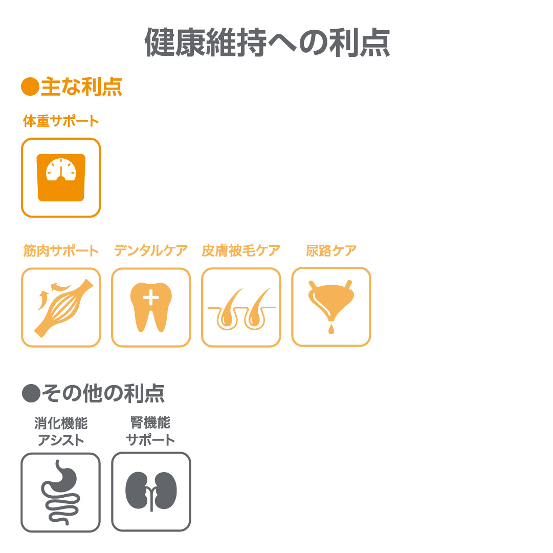 低糖質・高タンパク質組成が健康的な水分代謝を促し、リン含有量の低い良質なタンパク質により腎機能の維持をサポートします。