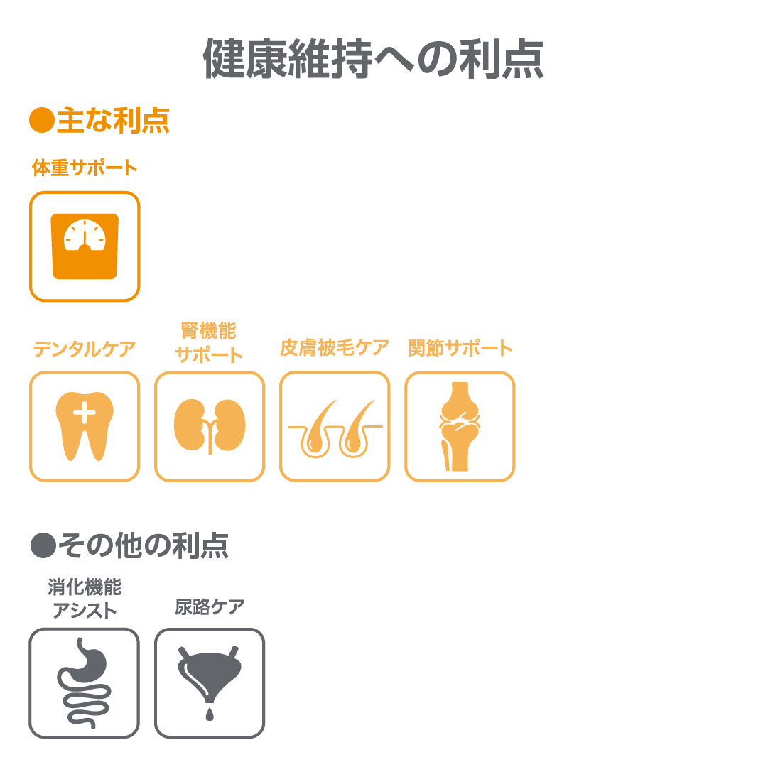 対象動物やライフステージに合わせ、製品ごとに異なるさまざまな利点を併せ持ちます。